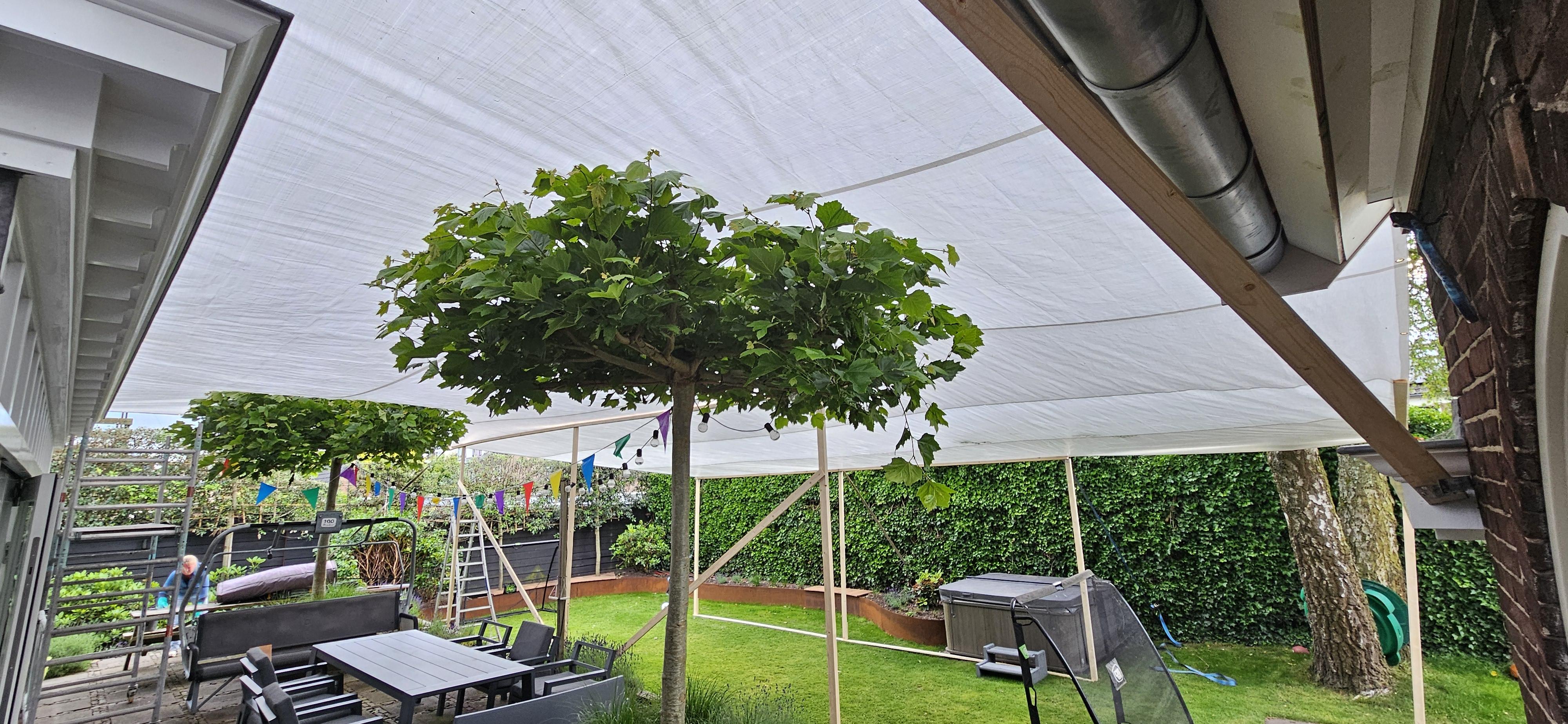 Het afdekzeil gebruiken we ter vervanging van het oude lekkende zeildak van ons tuinpaviljoen.