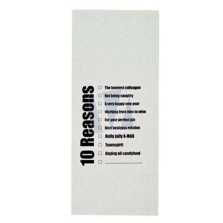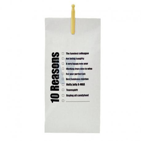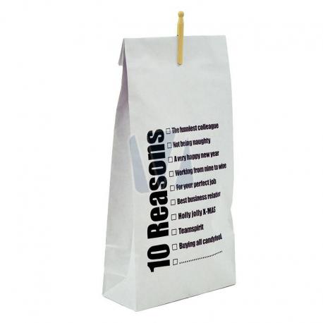 Bedrukte papieren zakken zijn leuk om te gebruiken als decoratiemateriaal of om een cadeau of geschenk in te verpakken. Deze witte bedrukte papieren zak met daarop de tekst '10 reasons' is geschikt voor vele, maar hoofdzakelijk werksituaties. Vul de reden in en de verpakking vertelt de ontvanger de oorzaak van het cadeau. De zak is stevig en duurzaam. Wordt geleverd inclusief houten knijper.